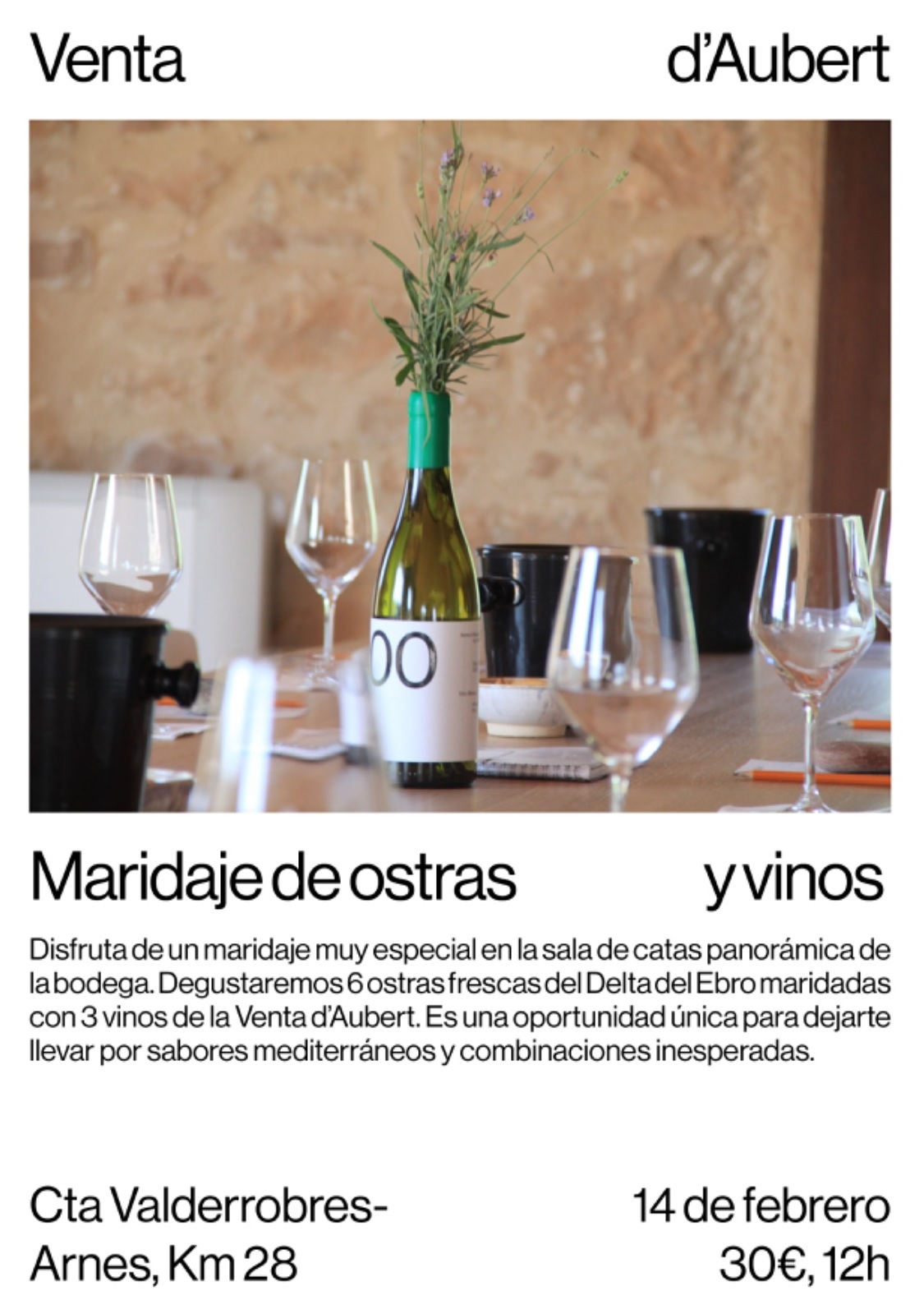 Sábado, 14 de febrero a las 12:00h. Maridaje de ostras y vinos en Venta d´Aubert de Cretas